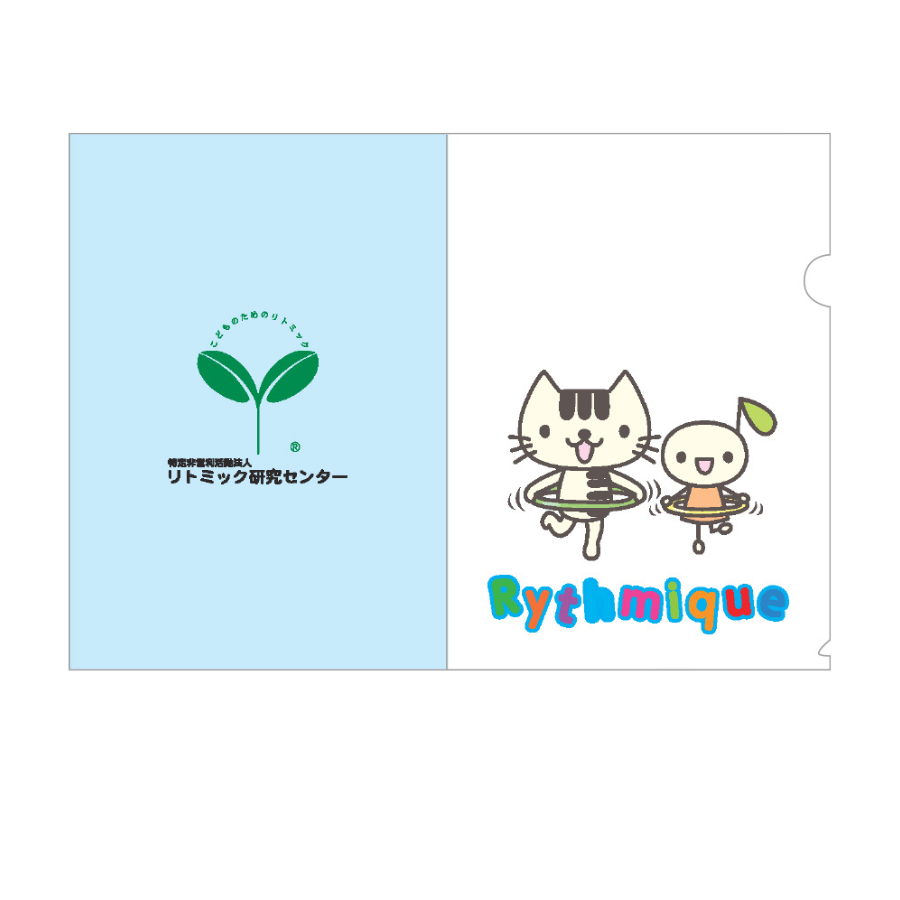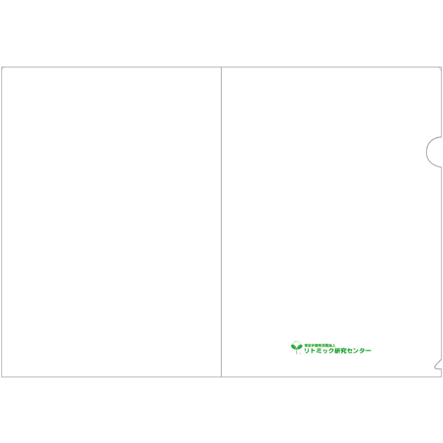 両面透明のクリアファイルに「リトミック研究センター」の名前が緑色で箔押しプリントされたシンプルなファイル。資料請求された方へ資料をお送りする際などにご利用ください。