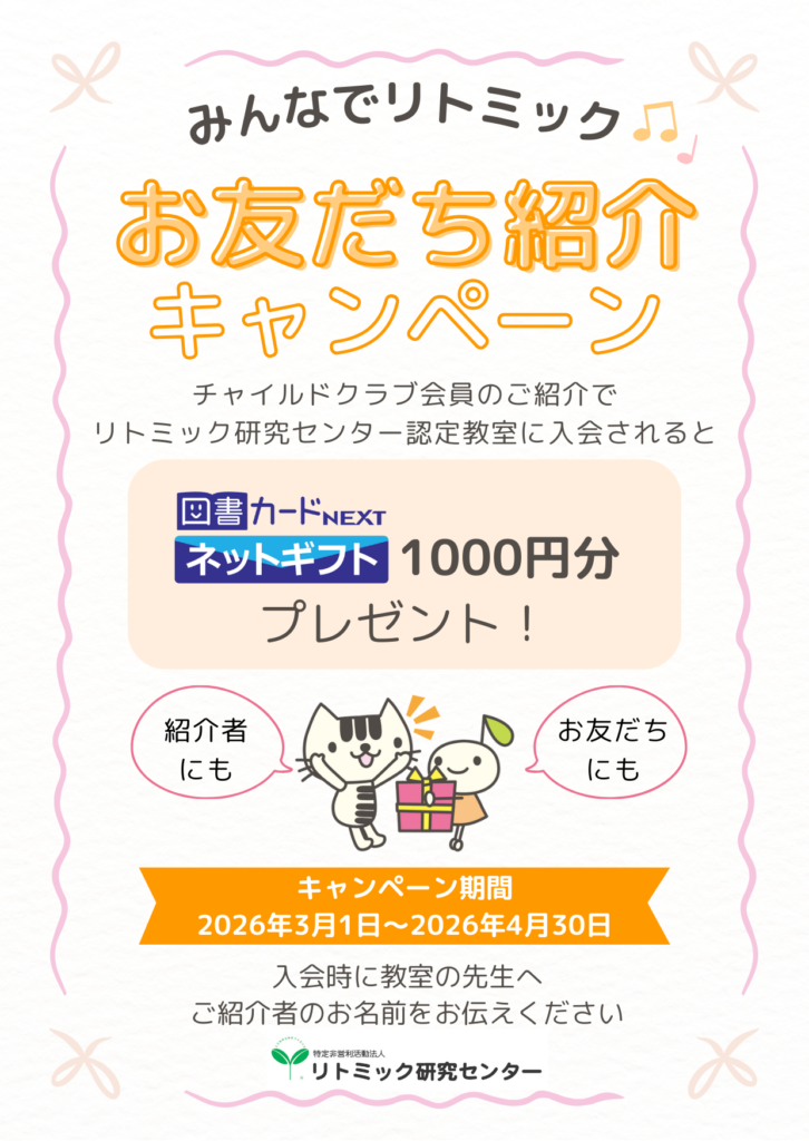 認定教室へ通っている生徒さんのご紹介で入会されると、入会者・紹介者ともに『図書カードネットギフト』1,000円分をプレゼント!